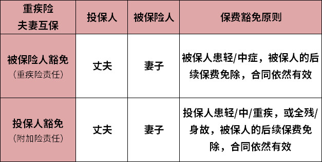 举个例子,老公给老婆买了一份重疾(老公交钱,保老婆)附加投保人豁免。万一老公遭遇不幸(生病或者去世),老婆的这份保单,后面的保费不用再交,合同仍然有效,以后该怎么赔还怎么赔。