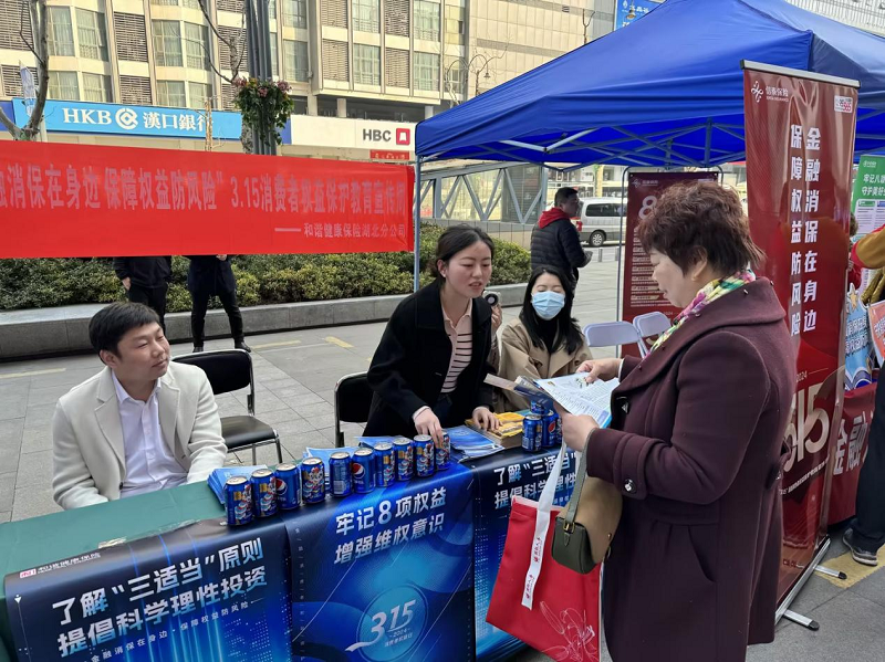 和谐健康湖北分公司员工热情向群众普及宣传并解答3.15消费者权益保护相关知识,现场不仅有大量老年人参与,还有青年市民前来参与此次活动,了解相关知识,活动气氛热烈。