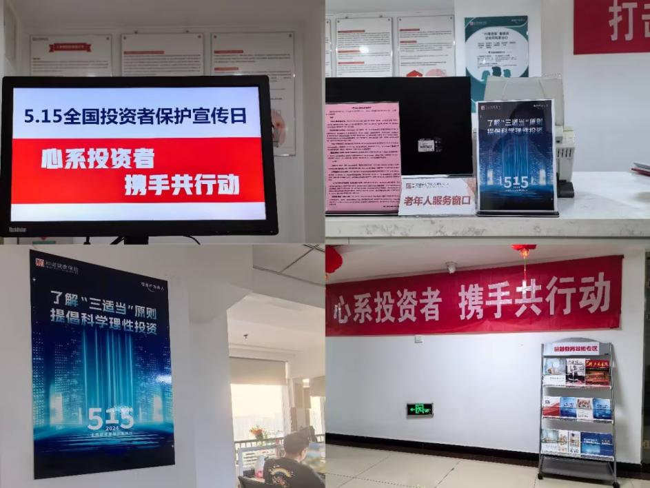 (一)分公司及中支围绕活动主题开展宣传活动,在办公职场悬挂“心系投资者  携手共行动”主题横幅,张贴“5·15”全国投资者保护宣传日海报,在金融知识宣传区摆放“了解‘三适当’原则,提倡科学理性投资”宣传折页供公司客户及员工学习,营造公司职场宣传氛围。对于“5·15”活动期间亲临公司办理业务的客户,主动向客户展示宣传资料,开展现场教育宣传活动。